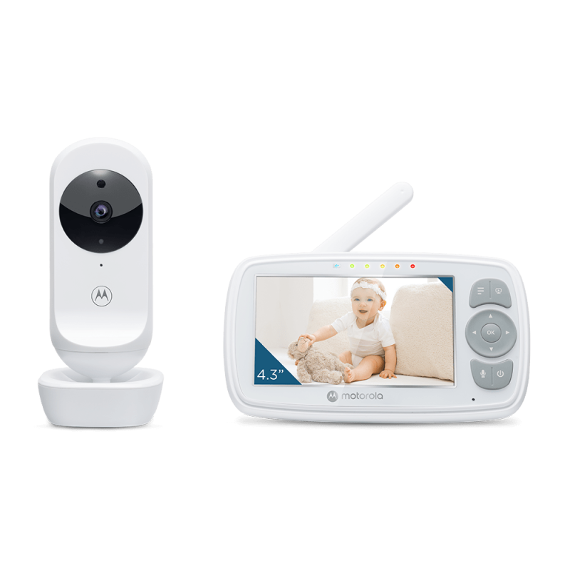 Motorola | Video Baby Monitor | VM34 4.3" | 4.3" diagonal color screen; Lullabies; Two-way talk; Room temperature monitoring; Infrared night vision; LED sound level indicator; 2.4GHz FHSS wireless technology for in-home viewing; Digital zoom; High sensitivity microphone; Rechargeable parent unit;Secure and private connection | White