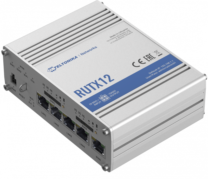 Dual LTE Cat 6 Router | RUTX12 | 802.11ac | 867 Mbit/s | 10/100/1000 Mbit/s | Ethernet LAN (RJ-45) ports 4 | Mesh Support No | MU-MiMO Yes | 4G | Antenna type 4xSMA for LTE, 2xRP-SMA for WiFi, 1xRP-SMA for Bluetooth, 1xSMA for GNNS | 1 x USB A