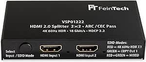 FeinTech VSP01222 HDMI 2.0 Splitter 2 Inputs 2 Outputs Scaler ARC Pass for