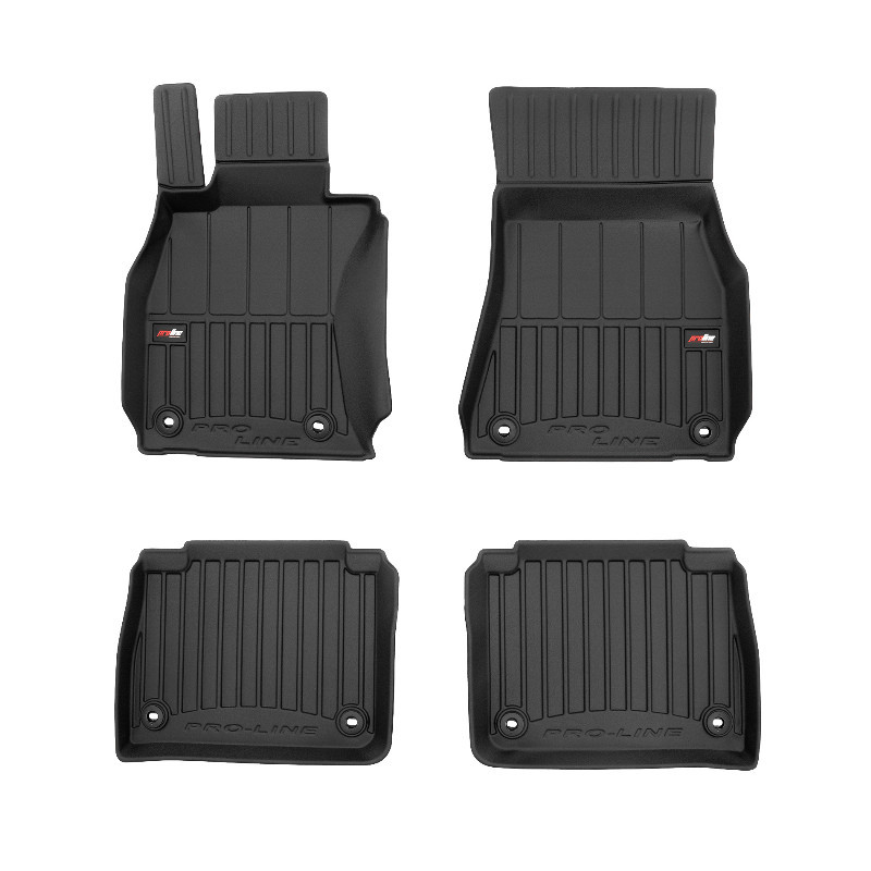 Guminiai ProLine 3D kilimėliai: (aukštos kokybės plastiko, gumos mišinys / TPE, komplektas - 4vnt., juodi, krašto aukštis 7 cm, montavimo būdas - spaustukai). AUTOMOBILIŲ KILIMĖLIAI FROGUM 3D PROLINE LUXURY • Dėl naujoviškos 3D skenavimo technologijos atitinka idealiai; • Kraštai papildomai apsaugoti – aukštis 7 cm, visada švarus automobilis; • Itin patvari medžiaga su unikalia neslystančia struktūra, atspari nešvarumams. • Išskirtinis stabilumas dėl spaustukų – lengvai montuojama spustelėjus; • Pakojo zonos apsauga – komfortas, leidžiantis nuleisti vairuotojo koją; 3D ProLine aukštos kokybės guminiai kilimėliai padeda išlaikyti automobilį švarų. Modernus ir funkcionalus dizainas, ir ypač aukštas kraštas garantuoja efektyvų vandens ir purvo surinkimą ir neleidžia jiems išbėgti. Taip automobilio salonas išlieka švarus. Pagaminti iš aukštos kokybės gumos, kurioje nėra toksiškų komponentų. Bekvapis. Kilimėliai idealiai atitinka ir puikiai priglunda prie salono grindų. Guminiai kilimėliai išlaiko savo elastingumą net esant temperatūros pokyčiams. Specialus paviršius neleidžia kilimėliams slysti vairuojant, o tai daro didelę įtaką saugumui ir kelionės patogumui