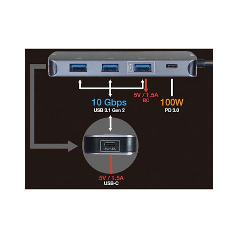 ROLINE USB 3.2 Gen 1 Hub, 4fach, Typ C Anschlusskabel, mit 1 PD-Port