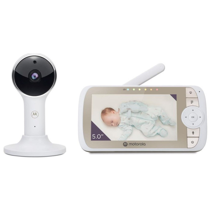 Motorola | Wi-Fi Video Baby Monitor with Mood Light | VM85 CONNECT 5.0" | 5" TFT color display with 480 x 272 resolution; Lullabies; Two-way talk; Room temperature monitoring; Infrared night vision; LED sound level indicator; Wi-Fi connectivity for on-the-go viewing; 2.4GHz FHSS wireless technology for in-home viewing; Remote pan scan, digital tilt and zoom; Remote pan scan, digital tilt and zooml; High sensitivity microphone; Secure and private connection; Multi-color mood light | White/Gold