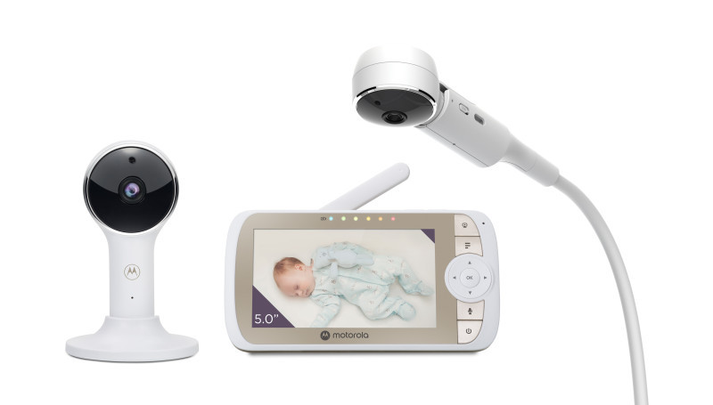 Motorola | Full HD Wi-Fi Video Baby Monitor with Crib Mount | VM65X CONNECT 5.0" | 5.0" LCD colour display with 480 x 272 resolution; Lullabies; Room temperature monitoring; Infrared night vision; LED sound level indicator; Wi-Fi connectivity for on-the-go viewing; 2.4GHz FHSS wireless technology for in-home viewing; Digital pan, tilt and zoom; High sensitivity microphone; Rechargeable parent unit; Secure and private connection; Over-the-crib mount; Flexible magnetic mount | White/Gold