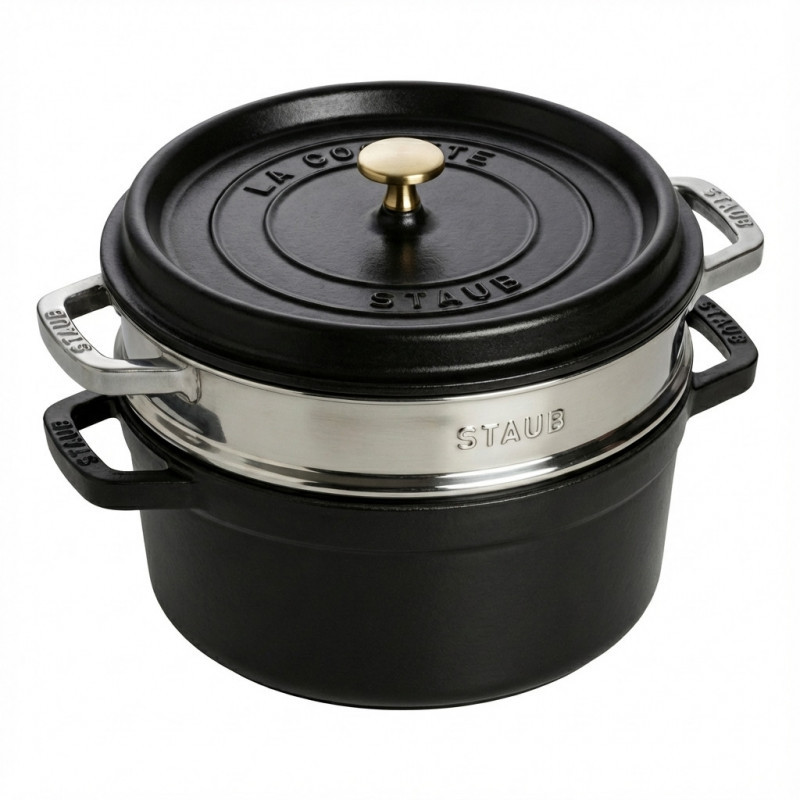 Staub La Cocotte 24 cm apvalus ketaus puodas su garinimo įdėklu, juodas