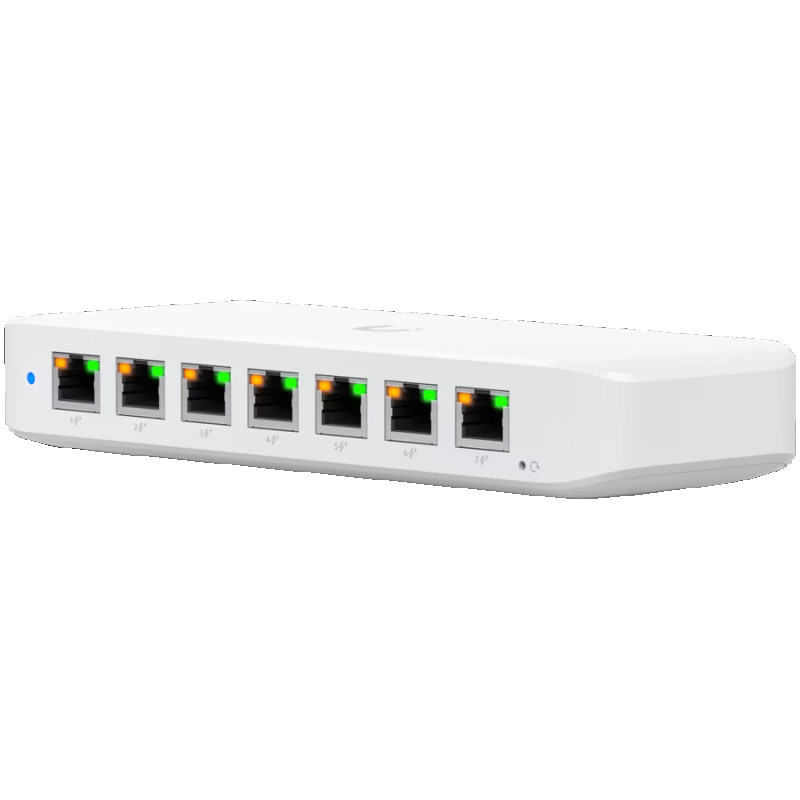 Ubiquiti USW-Ultra Layer 2, 8-port GbE PoE switch with versatile mounting options: 7x GbE PoE+ output ports, 1 xGbE PoE++ input port