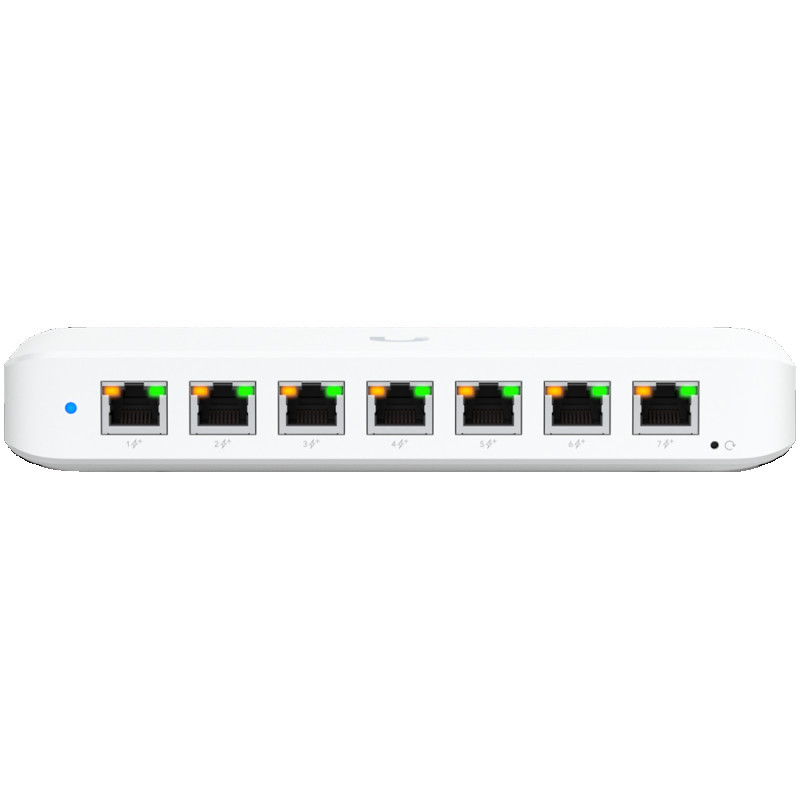 Ubiquiti USW-Ultra-210W-EU compact, Layer 2, 8-port GbE PoE switch with versatile mounting options, 7x GbE PoE+ output ports, GbE port with optional PoE++ input, 202W PoE availability with the included AC power adapter