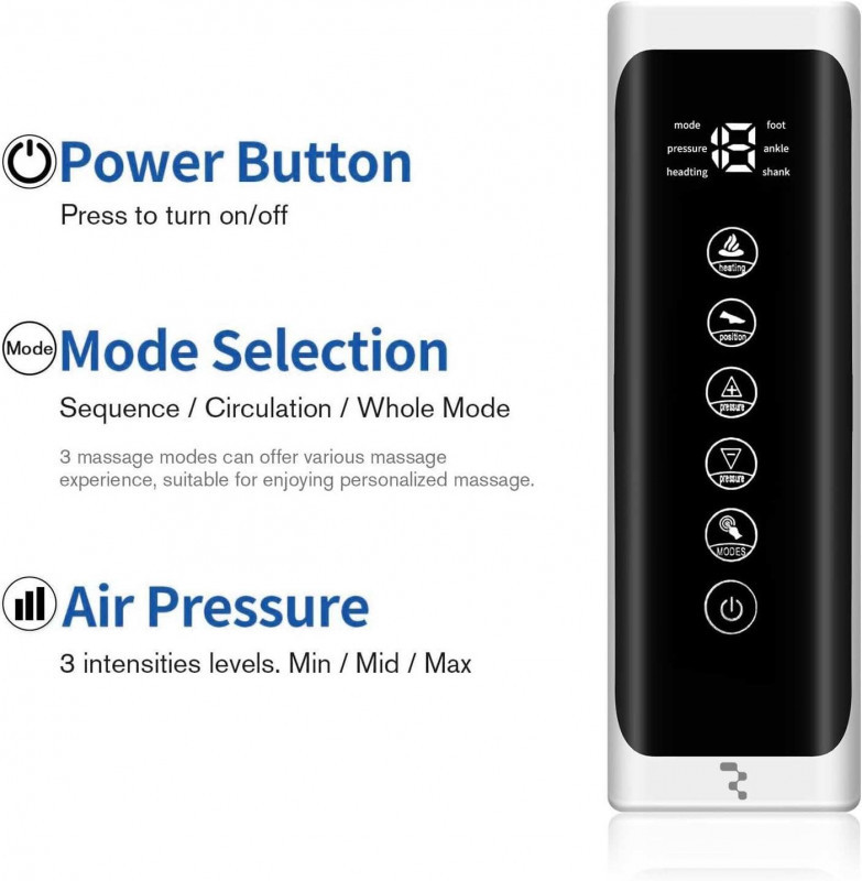 Trys masažuojamos zonos – pėdos, blauzdos ir šlaunys, galima pasirinkti atskirai arba kartu