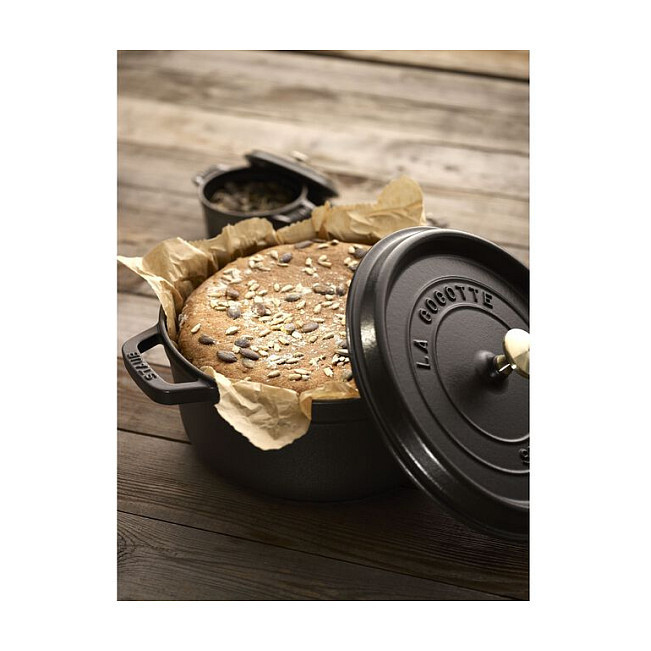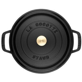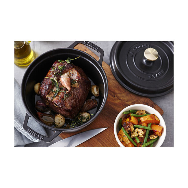 Staub La Cocotte 26 cm rundinė juodos spalvos ketaus troškintuvė – tai aukščiausios kokybės prancūziškas indas, skirtas lėtam troškinimui, kepimui ir kepinimui. Pagaminta iš emaliuoto ketaus, ši cocotte užtikrina tolygų šilumos paskirstymą ir ilgalaikį jos išlaikymą, todėl patiekalai iškepa tolygiai ir išlieka sultingi. Speciali dangčio struktūra su „aroma rain“ sistema leidžia kondensatui tolygiai lašėti atgal ant maisto, išsaugant natūralius skonius ir drėgmę.