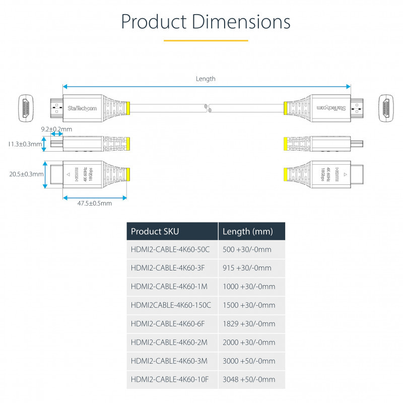 "StarTech.com 1.6ft (50cm) Premium Certified High Speed HDMI Cable, 4K 60Hz/1440p 144Hz, HDR10/HDCP 2.2/ARC, 18Gbps, UHD HDMI 2.0 Cord for TV/Monitor/Display, TPE Jacket. Cable length: 0.5 m, Connector 1: HDMI Type A (Standard), Connector 1 gender: Male, Connector 2: HDMI Type A (Standard), Connector 2 gender: Male, Connector contacts plating: Gold, HDMI version: 2.0, Data transfer rate: 18 Gbit/s, Audio Return Channel (ARC), Product colour: Black"\n"Connect reliably between HDMI UHD devices using this Premium Certified HDMI Cable
