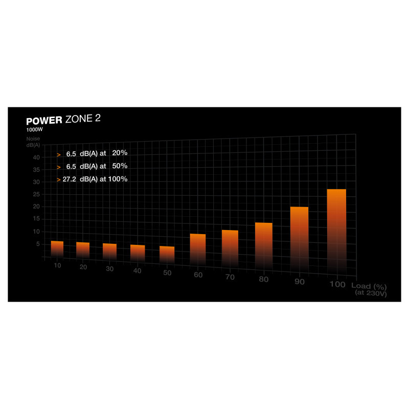 A large Pure Wings 3 140mm fan is keeping Power Zone 2 1000W cool. While under low load, the fan turns off completely until its services are needed again for more demanding operations. This post-ventilation requires a short cooldown period of 2-5 minutes to avoid frequent and annoying starts and stops of the fan. Combined with the large fan for active cooling, this power supply is exceptionally silent in all load scenarios.