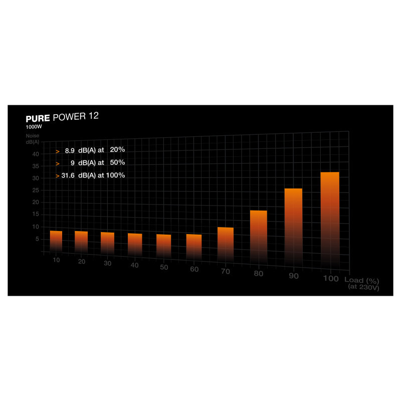 "be quiet! PURE POWER 12 1000W. Total power: 1000 W, AC input voltage: 110 - 240 V, Peak power: 1050 W. Motherboard power connector: 20+4 pin ATX, Motherboard power cable length: 55 cm, SATA power cable length: 500,650,800,950 mm. Purpose: PC, Power supply unit (PSU) form factor: ATX, 80 PLUS certification: 80 PLUS Gold. Product colour: Black, Cooling type: Active, Fan diameter: 12 cm. Cables included: AC"\n"Exceptional quiet, superior features