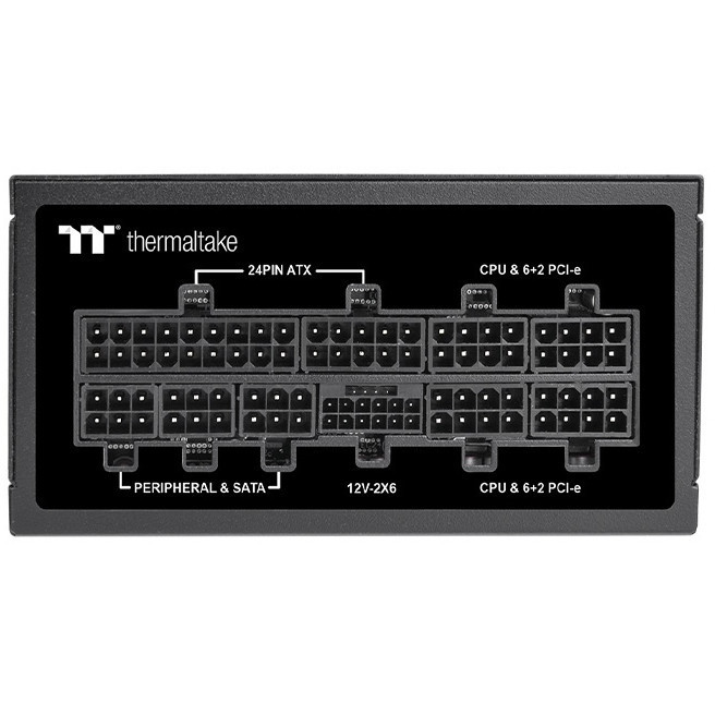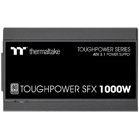 "Thermaltake Toughpower SFX Platinum 1000W - TT Premium Edition. Total power: 1000 W, AC input voltage: 100 - 240 V, AC input frequency: 50/60 Hz. Motherboard power connector: 24-pin ATX, Motherboard power cable length: 30 cm, SATA power cable length: 750,600,450,300 mm. Purpose: PC, Power supply unit (PSU) form factor: CFX, 80 PLUS certification: 80 PLUS Platinum. Product colour: Black, Cooling type: Active, Fan diameter: 9 cm. Safety: CE/UKCA/FCC/ICES/CB/TUV/cTUVus/LVD/CCC/BSMI/ S-MARK/EAC/RCM"\n"Toughpower SFX Platinum series is 80 PLUS Platinum certified and compatible with ATX 3.1 specifications. Designed with a native 12V-2x6 connector.