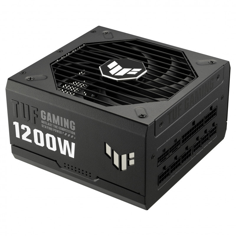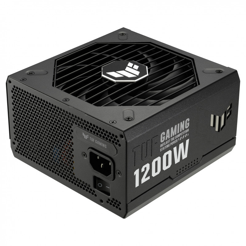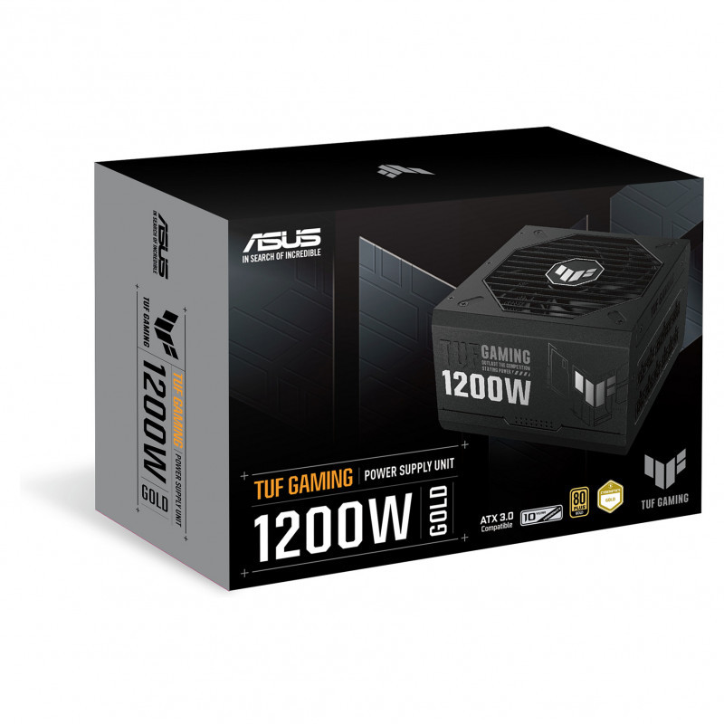 "ASUS TUF GAMING 1200W Gold. Total power: 1200 W, AC input voltage: 100 - 240 V, Combined power (+3.3V): 130 W. Motherboard power connector: 20+4 pin ATX, Motherboard power cable length: 61 cm, SATA power cable length: 120,400 mm. Purpose: PC, Power supply unit (PSU) form factor: ATX, 80 PLUS certification: 80 PLUS Gold. Product colour: Black, Cooling type: Active, Fan diameter: 13.5 cm. Cables included: AC, CPU, PCIe, Peripheral (Molex), SATA"\n"The TUF Gaming 1200W Gold is an efficient, resilient and dependable PSU that’s engineered for the long haul.
