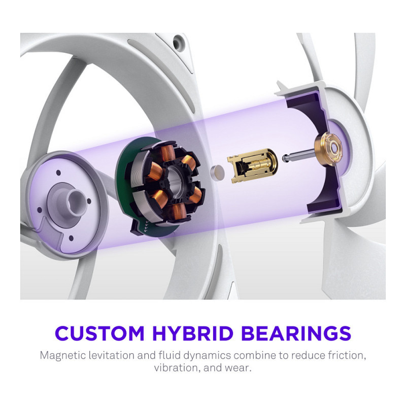 - Custom Hybrid Bearing: Magnetic levitation keeps the rotor centered and stable at high speeds, while fluid dynamic lubrication reduces friction and wear for smooth, durable, and quiet operation.
