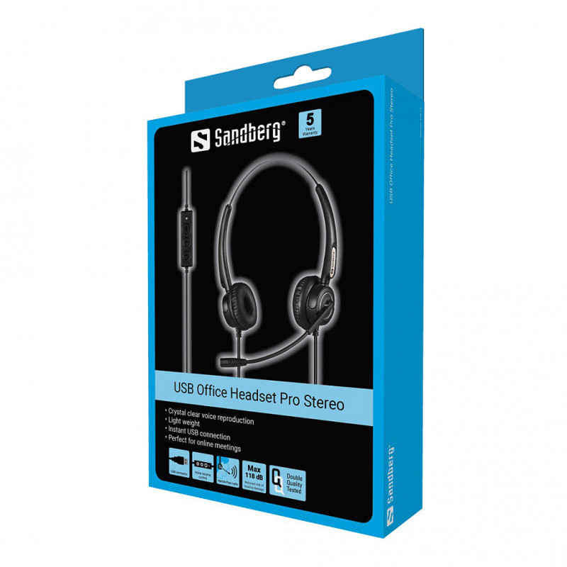 "Sandberg USB Office Headset Pro Stereo. Product type: Headset. Connectivity technology: Wired. Recommended usage: Office/Call center. Headphone frequency: 20 - 20000 Hz. Cable length: 2.1 m. Weight: 115 g. Product colour: Black"\n"The Sandberg USB Office Headset Pro Stereo is of outstanding quality and can be used for, e.g. your home office, workplace or studying. The microphone is on a flexible arm, which ensures that the other person can hear you clearly. A speaker for each ear also means that reproduction of the other person's speech is clear and distinct. The discreet lightweight construction with soft ear pads and adjustable headband provides you with optimal comfort. Built-in max. volume of 118 db to avoid damage to your hearing. Connects through a USB port and works immediately. Inline volume control."