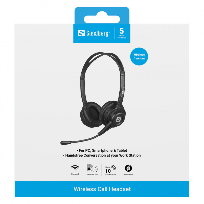 "Sandberg Wireless Call Headset. Product type: Headset. Connectivity technology: Wireless, Bluetooth. Recommended usage: Music/Everyday. Headphone frequency: 20 - 20000 Hz. Wireless range: 10 m. Weight: 45 g. Product colour: Black"\n"Sandberg Wireless Call Headset is a wireless headset for use in such locations as a home office, work or for teaching. The microphone is on a flexible arm, which ensures that the other person can hear you clearly. A speaker for each ear also means that reproduction of the other person's speech is clear and distinct. The discreet lightweight construction and adjustable headband provide you with optimal comfort. Connect to PC, smartphone or tablet via Bluetooth for immediate use. Volume control directly on the headset."