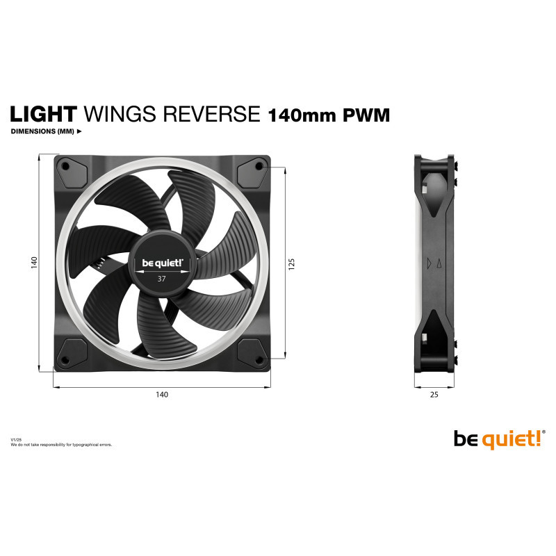"be quiet! Light Wings 140 mm PWM Reverse Black. Type: Fan, Fan diameter: 14 cm, Rotational speed (max): 1300 RPM, Airflow: 87.3 m³/h, Maximum air pressure: 1.1 mmH2O, Bearing type: Rifle bearing. Voltage: 5 - 13.2 V. Product colour: Black"\n"Impressive lighting, superior cooling