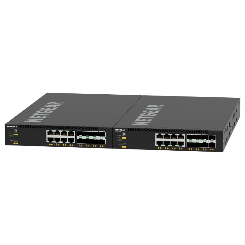 "NETGEAR M4350-8X8F. Switch type: Managed, Switch layer: L3. Basic switching RJ-45 Ethernet ports type: 10G Ethernet (100/1000/10000), Basic switching RJ-45 Ethernet ports quantity: 8. Full duplex. MAC address table: 16000 entries, Switching capacity: 320 Gbit/s. Networking standards: IEEE 802.1D, IEEE 802.1Q, IEEE 802.1Qav, IEEE 802.1s, IEEE 802.1w, IEEE 802.1x, IEEE 802.3, IEEE.... Power connector: AC-in jack. Rack mounting, Form factor: 1U"\n"POWER AND THROUGHPUT