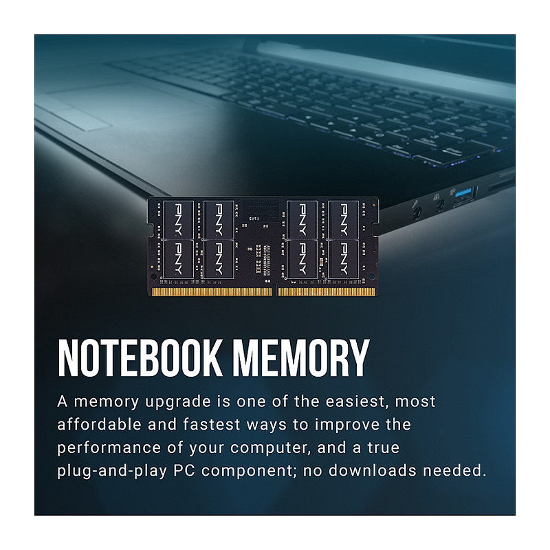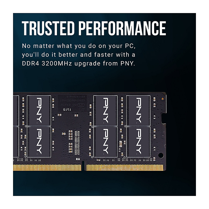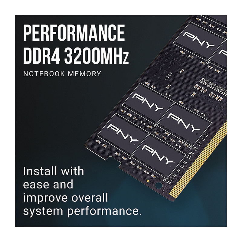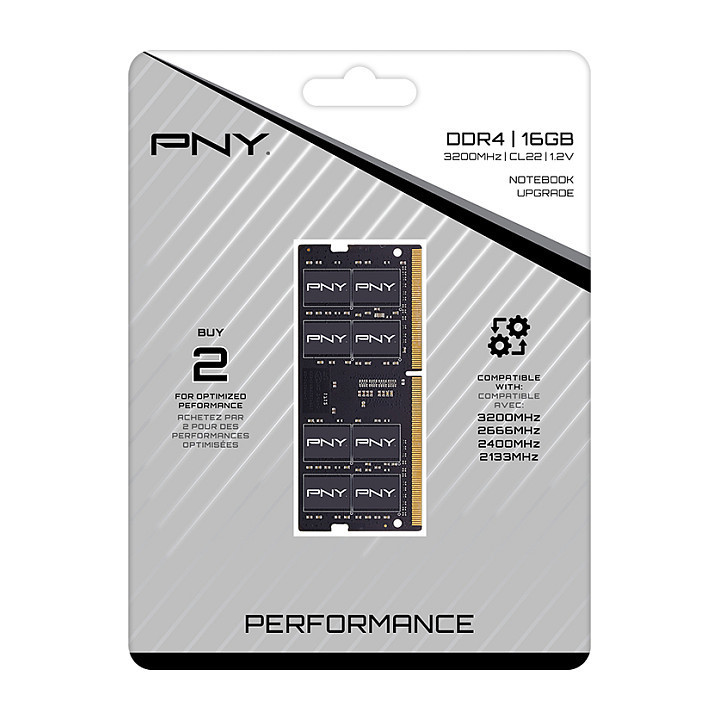 "PNY Performance. Component for: Laptop, Internal memory: 16 GB, Memory layout (modules x size): 1 x 16 GB, Internal memory type: DDR4, Memory clock speed: 3200 MHz, Memory form factor: 260-pin SO-DIMM, CAS latency: 22"\n"GET BETTER PC PERFORMANCE WITH A PNY DDR4 PC MEMORY UPGRADE