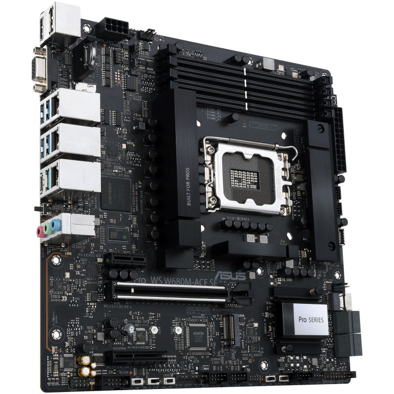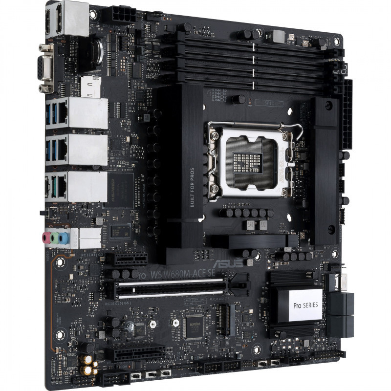 "ASUS PRO WS W680M-ACE SE. Processor manufacturer: Intel, Processor socket: LGA 1700, Compatible processor series: Intel® Core™ i3, Intel® Core™ i5, Intel® Core™ i7, Intel® Core™ i9. Supported memory types: DDR5-SDRAM, Maximum internal memory: 192 GB, Memory slots type: DIMM. Supported storage drive interfaces: M.2, NVMe, PCI Express 4.0, SATA III, SlimSAS, Supported storage drive types: HDD & SSD, RAID levels: 0, 1, 5, 10. Ethernet interface type: 2.5 Gigabit Ethernet, Gigabit Ethernet. Component for: PC, Motherboard form factor: micro ATX, Motherboard chipset family: Intel"\n"WORKSTATION MOTHERBOARD