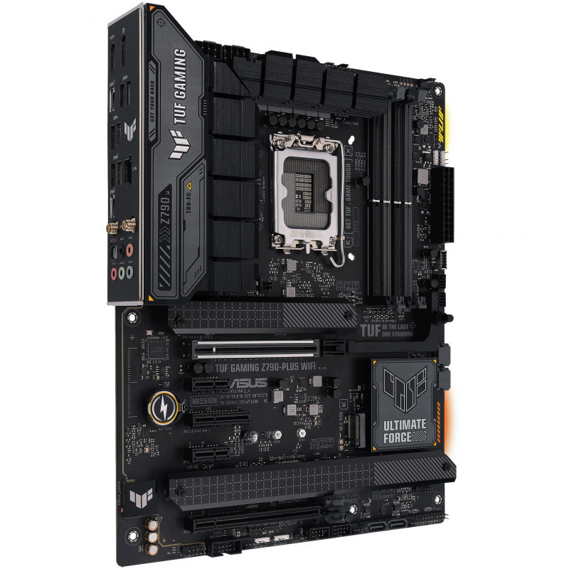 "ASUS TUF GAMING Z790-PLUS WIFI. Processor manufacturer: Intel, Processor socket: LGA 1700, Compatible processor series: Intel® Celeron®, Intel® Core™ i3, Intel® Core™ i5, Intel® Core™ i7, Intel® Core™ i9,.... Supported memory types: DDR5-SDRAM, Maximum internal memory: 128 GB, Memory slots type: DIMM. Supported storage drive interfaces: M.2, SATA III, Supported storage drive types: HDD & SSD, RAID levels: 0, 1, 5, 10. Ethernet interface type: 2.5 Gigabit Ethernet, Top Wi-Fi standard: Wi-Fi 6 (802.11ax), Wi-Fi standards: 802.11a, 802.11b, 802.11g, Wi-Fi 4 (802.11n), Wi-Fi 5 (802.11ac), Wi-Fi 6 (802.11ax). Component for: PC, Motherboard form factor: ATX, Motherboard chipset family: Intel"\n"TUF GAMING Z790-PLUS WIFI takes all the essential elements of the latest Intel® processors and combines them with game-ready features and proven durability. Engineered with military-grade components, an upgraded power solution and a comprehensive cooling system, this motherboard goes beyond expectations with rock-solid performance for marathon gaming. TUF GAMING motherboards also undergo rigorous endurance testing to ensure that they can handle conditions where others may fail. Aesthetically, this model incorporates an embossed nameplate and geometric design elements to reflect the dependability and stability that defines the TUF GAMING series.