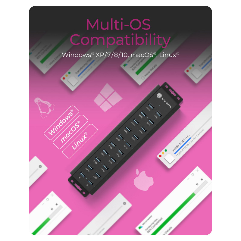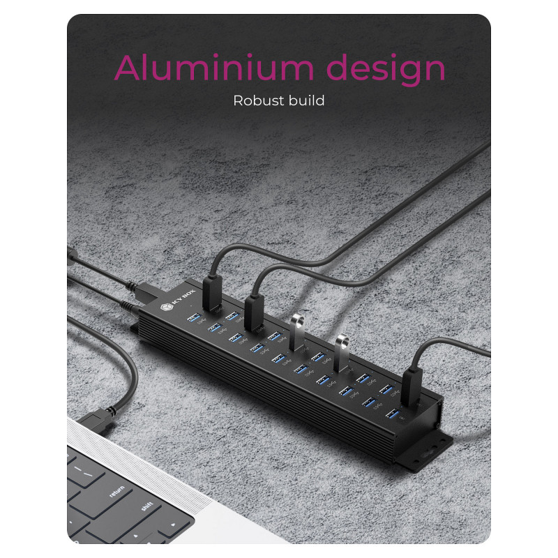 "ICY BOX IB-HUB1720-U3. Hub interfaces: USB 3.2 Gen 1 (3.1 Gen 1) Type-A. Product colour: Black, Housing material: Aluminium, LED indicators: Access, Power. Power supply type: USB, Power supply: 15 W. Width: 65 mm, Depth: 248 mm, Height: 30 mm. Package weight: 1.28 kg"\n