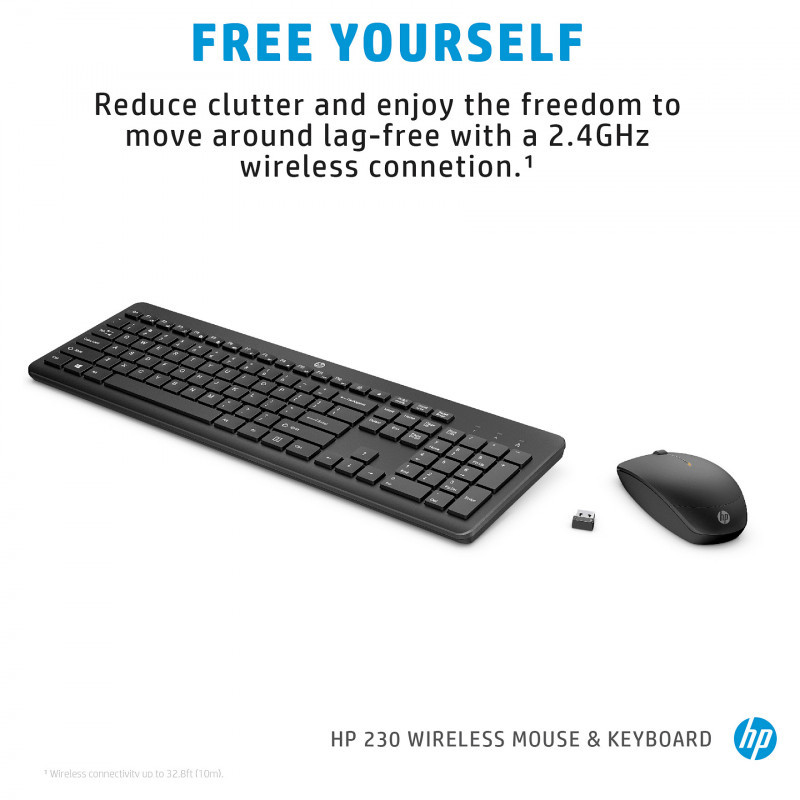 "HP 230 Wireless Mouse and Keyboard Combo. Keyboard form factor: Full-size (100%), Connectivity technology: Wireless, Device interface: RF Wireless, Keyboard key switch: Membrane, Recommended usage: Office. Product colour: Black. Mouse included"\n"Built for comfort, made for quiet