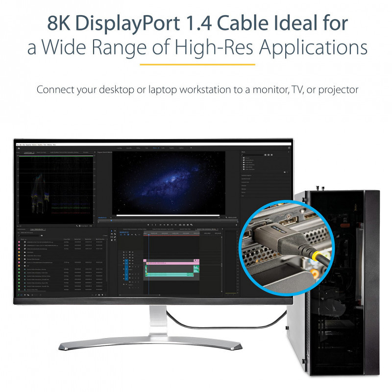 This DisplayPort 1.4 cable connects your DisplayPort™ laptop or desktop computer to an ultra-high definition 8K monitor, TV or projector. It supports resolutions up to 8K (7680 x 4320) at 60Hz.