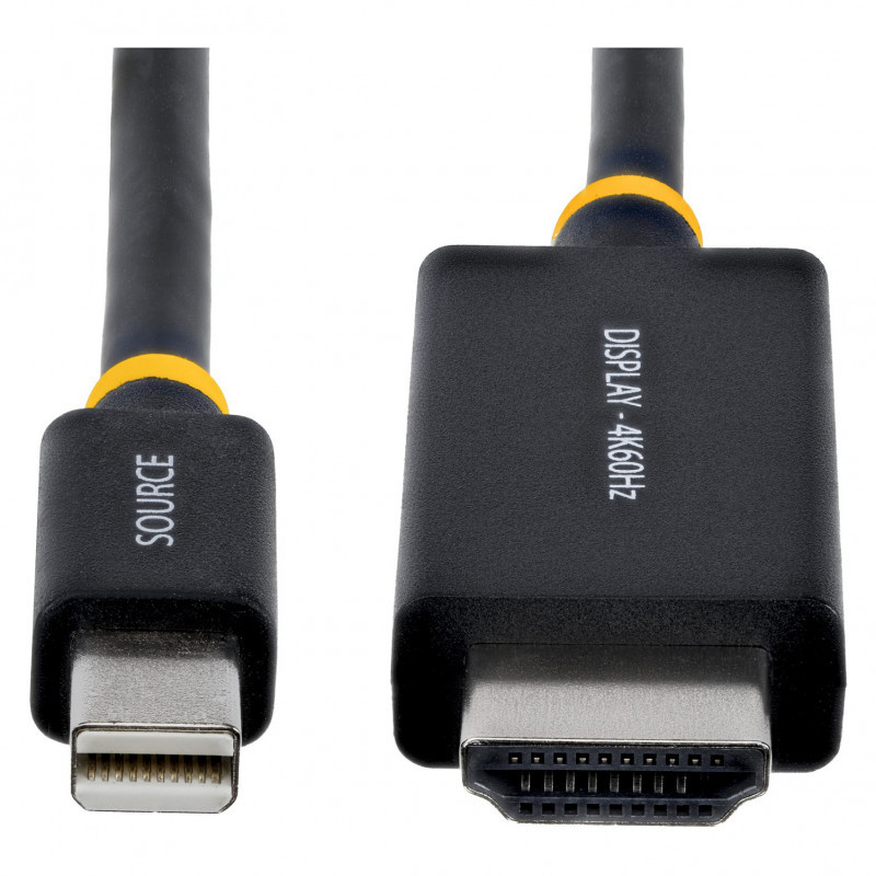 "StarTech.com 1m (3ft) Mini DisplayPort to HDMI Adapter Cable, 4K 60Hz with HBR3/HDCP 2.3/DPCP, MDP to HDMI 2.0, Active Video Converter, Mini DisplayPort Desktop to HDMI Monitor. Cable length: 1 m, Connector 1: Mini DisplayPort, Connector 2: HDMI Type A (Standard). Compliance certificates: RoHS. Cable diameter: 5 mm. Package width: 200 mm, Package depth: 128 mm, Package height: 15 mm. Quantity per pack: 1 pc(s)"\n"Connect a Mini DisplayPort source to an HDMI display with support for up to 4K 60Hz UHD video