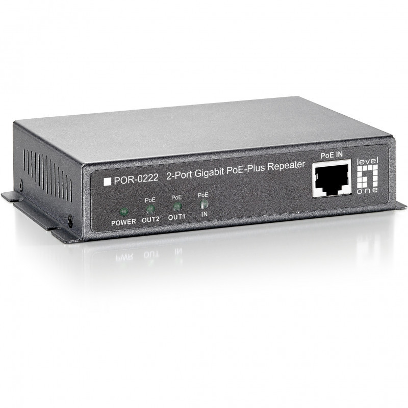 "LevelOne Industrial IP67 PoE BT extender/repeater. Type: Network repeater, Maximum transfer distance: 100 m, International Protection (IP) code: IP67. Networking standards: IEEE 802.3, IEEE 802.3ab, IEEE 802.3af, IEEE 802.3at, IEEE 802.3bt, IEEE 802.3u, IEEE 802.3x. Product colour: Black, Mounting type: Wall, LED indicators: Activity, Power. Power consumption (typical): 5 W, Output voltage: 36 - 57 V. Width: 125.8 mm, Depth: 73.5 mm, Height: 44.3 mm"\n"The LevelOne POR-1322 is the perfect accessory to increase your Power over Ethernet network performance. Normal ethernet cable runs only reach 100 meters, but with POR-1322 installers can extend the PoE network performance up to 500 meters with 4 nodes . Simple yet durable, no software required. As a PoE Repeater, POR-1322 receives all power from the Power Sending Equipment (PSE), for example, a PoE switch. This means that POR-1322 uses no external power supply, making it the most flexible option for system integrators looking for an easy, affordable solution to increase the distance to the attached devices. The POR-1322 is the perfect solution for taking Ethernet to areas such as roof tops, factory floors, airports manufacturing plants, and large warehouses.