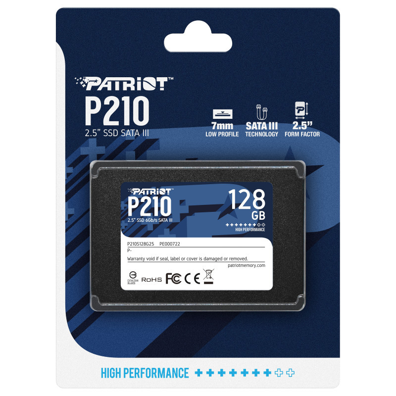 "Patriot Memory P210. SSD capacity: 128 GB, SSD form factor: 2.5"", Read speed: 450 MB/s, Write speed: 430 MB/s, Component for: PC/Laptop"\n"Patriot's next generation 2.5"" SATA III, P210 SSD, is designed with the latest SATA 3 controller, capable of delivering capacities of up to 2TB. This cost-effective solid-state drive is great for condensing more data into a smaller space, providing you with the technology to easily store everything you need. Patriot’s P210 improves your system's performance with more storage than ever.