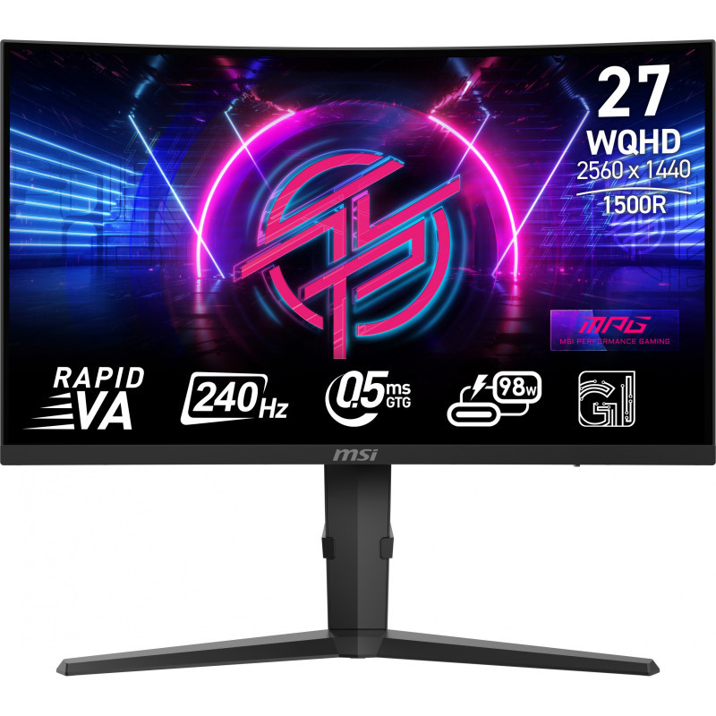 "MSI MPG 275CQRXFDE. Display diagonal: 68.6 cm (27""), Display resolution: 2560 x 1440 pixels, HD type: Wide Quad HD, Response time: 0.5 ms, Native aspect ratio: 16:9, Viewing angle, horizontal: 178°, Viewing angle, vertical: 178°. Built-in USB hub. VESA mounting, Height adjustment. Product colour: Black"\n"The MSI PERFORMANCE GAMING (MPG) series represents the perfect blend of style and performance. Every product in the MPG series is meticulously engineered to not only elevate your gaming experience but also to showcase individuality through stunning aesthetics and innovative technology."