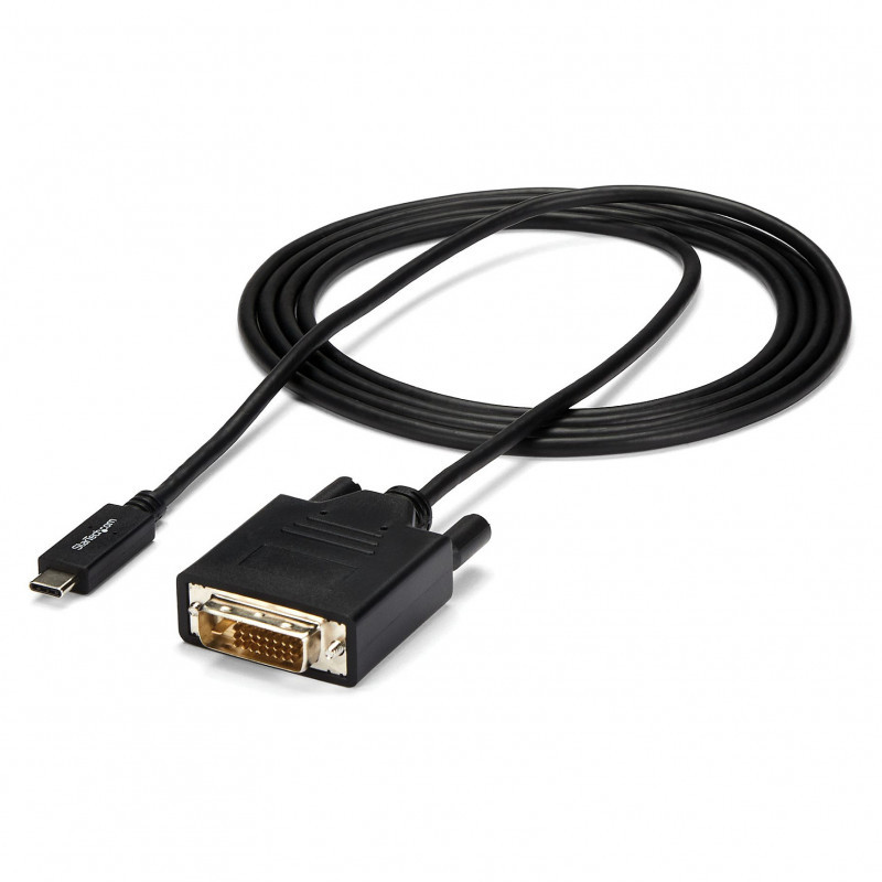 "StarTech.com 6.6 ft. (2m) USB-C to DVI Cable - 1920 x 1200 - Black. Cable length: 2 m, Connector 1: USB Type-C, Connector 2: DVI-D. Compliance certificates: CE, RoHS. Weight: 147 g, Depth: 2000 mm. Package width: 125 mm, Package depth: 225 mm, Package height: 26 mm. Quantity per pack: 1 pc(s)"\n"USB Type-C™ to DVI Adapter Cable | Thunderbolt™ 3 Compatible