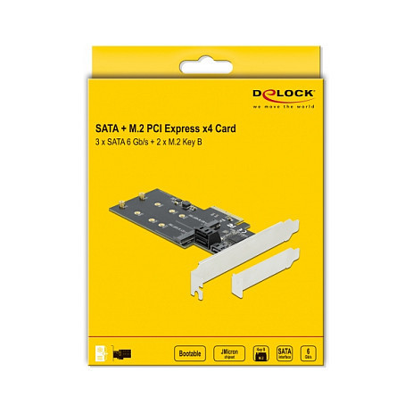 "DeLOCK 3 port SATA and 2 slot M.2 Key B PCI Express x4 Card - Low Profile Form Factor. Host interface: PCIe, Output interface: M.2, SATA. Data transfer rate (max): 6 Gbit/s. Cables included: SATA"\n"The PCI Express card by Delock expands a PC by three internal SATA ports and two M.2 slots. Different devices such as SSDs, hard drives, DVD-drives etc. and two M.2 modules in 2280, 2260, 2242 or 2230 format can be connected to the card."