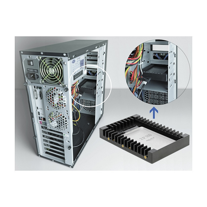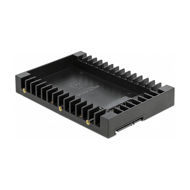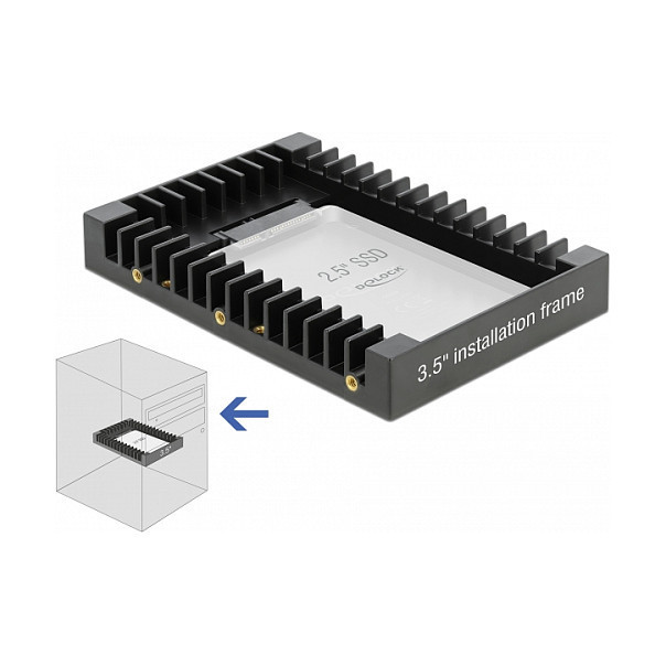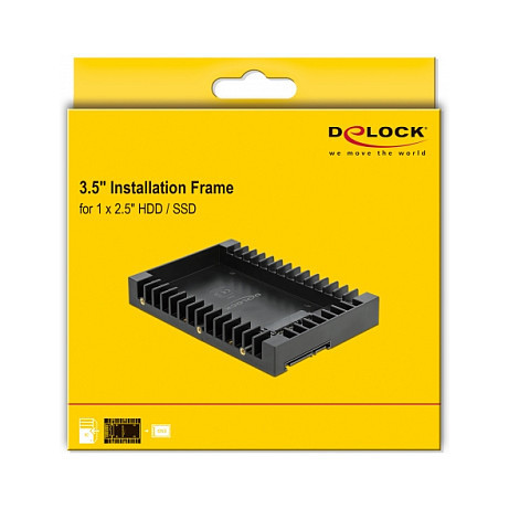 "DeLOCK 3.5″ Installation Frame for 2.5″ SATA drive black. Size (imperial): 8.89 cm (3.5""), Type: Storage drive tray, Product colour: Black. Width: 101 mm, Depth: 147 mm, Height: 20 mm. Quantity per pack: 1 pc(s)"\n"With this installation frame by Delock a 2.5″ drive, such as an SSD or HDD, can be mounted in a 3.5″ drive bay of a PC. The extensive installation options allow a secure attachment of the frame."
