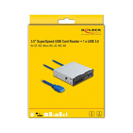 "DeLOCK 3.5″ SuperSpeed USB Card Reader 6 slots + 1 x USB Type-A female. Compatible memory cards: CF, CF Type II, MMC, MMC Mobile, MMC+, MMCmicro, MS Micro (M2), MS PRO, MS PRO Duo, MS Pro-HG,..., Product colour: Black, Grey, Supported drive bays: 3.5"". Cable length: 0.5 m. Quantity per pack: 1 pc(s), Package type: Box. Compatible operating systems: Linux Kernel 5.8+ Windows 8.1/8.1-64/10/10-64"\n"This card reader by Delock can be installed into a free 3.5″ bay a PC and will be connected to a USB pin header port. It has six different card reader slots and enables the connection of one USB device."