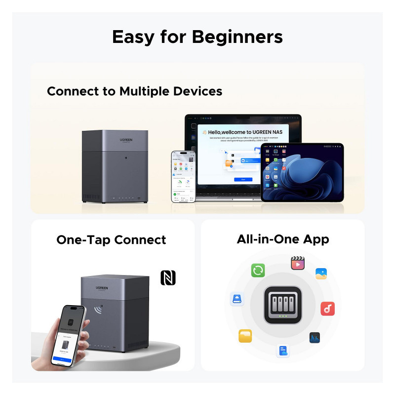 User-Friendly App & Easy to Use: Connect quickly via NFC, set up simply and share files fast on Windows, macOS, Android, iOS, web browsers, and smart TVs. You can access data remotely from any of your mixed devices. What's more, UGREEN NAS enclosure comes with beginner-friendly user manual and video instructions to ensure you can easily take full advantage of its features.