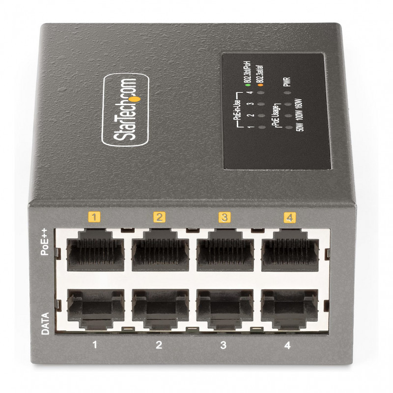 "StarTech.com 4-Port Multi-Gigabit PoE++ Injector, 5/2.5/1G Ethernet (NBASE-T), PoE/PoE+/PoE++ (802.3af/802.3at/802.3bt), 160Watts Power Budget, Wall/DIN Rail Mountable, Unmanaged. Ethernet interface type: 2.5 Gigabit Ethernet, 5 Gigabit Ethernet, Fast Ethernet, Gigabit Ethernet, Ethernet LAN data rates: 10,100,1000,2500,5000 Mbit/s, Networking standards: IEEE 802.3ab, IEEE 802.3af, IEEE 802.3at, IEEE 802.3bt, IEEE 802.3i, IEEE 802.3u. Product colour: Grey, Housing material: Metal, Maximum operating distance: 100 m. AC adapter input voltage: 100 - 240 V, Input current: 2.5 A, AC adapter output voltage: 54 V. Compliance certificates: CE, Federal Communications Commission (FCC), UKCA. Width: 70 mm, Depth: 94 mm, Height: 39 mm"\n"Supply power and data to up to four remote Powered Devices (PDs) with this PoE/PoE+/PoE++ injector
