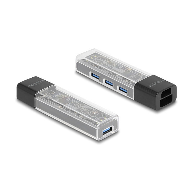 "DeLOCK 64335. Host interface: USB 3.2 Gen 1 (3.1 Gen 1) Type-A + Type-C, Hub interfaces: USB 3.2 Gen 1 (3.1 Gen 1) Type-A. Data transfer rate: 5000 Mbit/s, Product colour: Black, Transparent, Housing material: Plastic. Power supply type: USB. Windows operating systems supported: Windows 10, Windows 10 x64, Windows 11, Mac operating systems supported: Mac OS 12.4, Mac OS 13.1, Mac OS 14.5, Mac OS X 13.0 Ventura, Mac OS X 14.0 Sonoma, Mac OS X 15.0..., Linux operating systems supported: Linux Kernel 6.2, Linux Kernel 6.5. Width: 27 mm, Depth: 104 mm, Height: 17 mm"\n"This solid USB hub by Delock can be connected to a computer, laptop or mobile device via the USB Type-A or USB-C™ interface. It expands the computer by 4 USB Type-A ports. Different USB devices such as USB flash memory, card reader, external enclosure etc. can be connected.