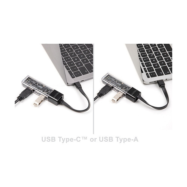 Due to the specially designed cable, the Delock hub can be quickly and easily connected to the USB Type-A or USB-C™ socket. Thus, it can be easily connected to new devices with USB Type-C™ female and older devices that only have a USB Type-A connector.