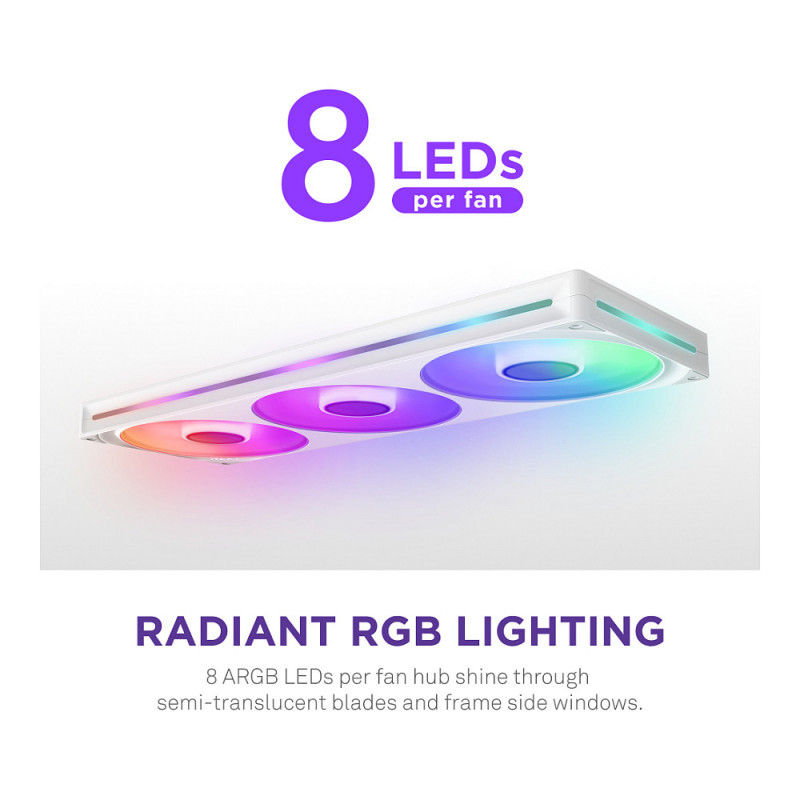 8 aRGB LEDs per fan hub shine through semi-translucent blades and frame side windows.