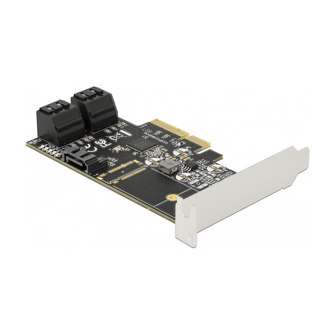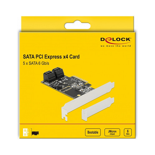 "DeLOCK 90395. Host interface: PCIe, Output interface: SATA. Product colour: Green. Data transfer rate (max): 6 Gbit/s. Cables included: SATA, Package type: Hanging box"\n"The PCI Express card by Delock expands a PC by five internal SATA ports. Different devices such as SSDs, hard drives, DVD-drives etc. can be connected to the card."