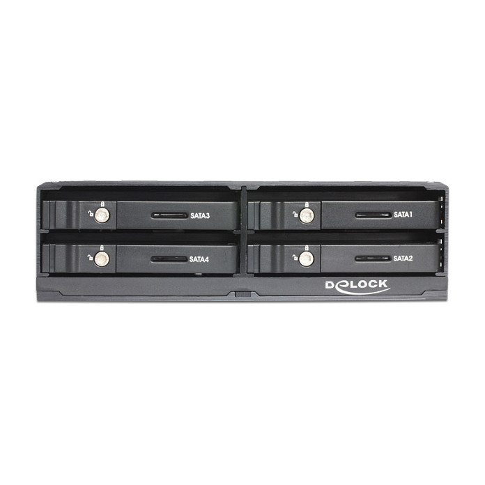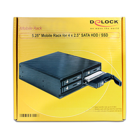 "DeLOCK 47220. Product colour: Black, Number of fans: 1 fan(s), Data transfer rate: 6 Gbit/s"\n"This mobile rack can be installed into a free 5.25″ bay of your desktop PC and enables the operation and a quick exchange of up to four 2.5″ SATA HDD."