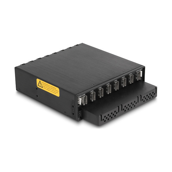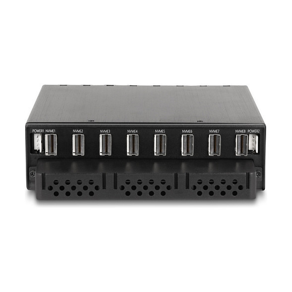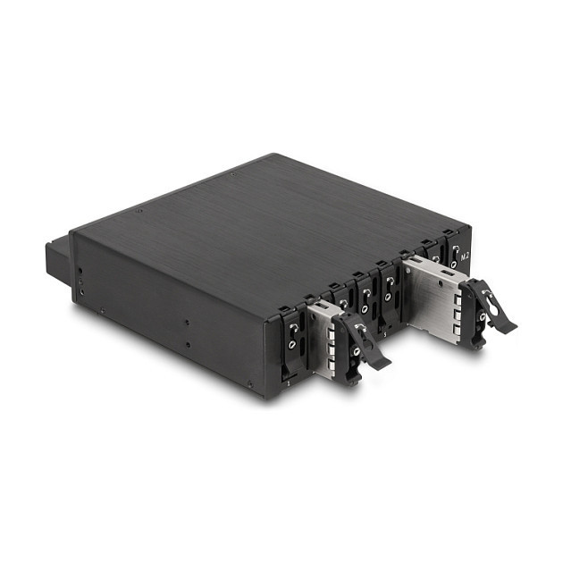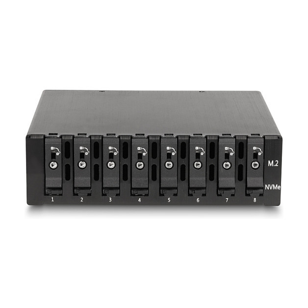 "DeLOCK 5.25″ Mobile Rack for 8 x M.2 NVMe SSD with Slim SAS SFF-8654 connector. Size (imperial): 13.3 cm (5.25""), Type: Storage drive tray, Product colour: Black. Width: 145 mm, Depth: 174 mm, Height: 40 mm. Quantity per pack: 1 pc(s), Number of lock keys included: 2 pc(s). Windows operating systems supported: Windows 10, Windows 10 x64, Windows 11, Linux operating systems supported: Linux Kernel 6.2"\n"Description