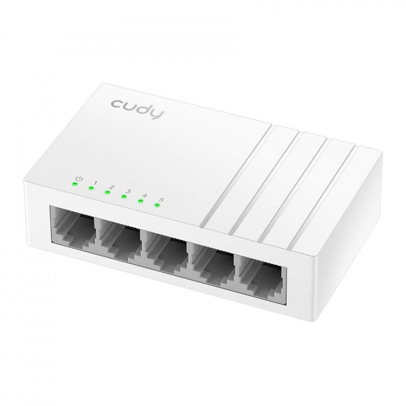 "Cudy GS105U. Switch type: Unmanaged. Basic switching RJ-45 Ethernet ports type: Gigabit Ethernet (10/100/1000), Basic switching RJ-45 Ethernet ports quantity: 5. MAC address table: 2048 entries, Switching capacity: 10 Gbit/s. Networking standards: IEEE 802.3ab, IEEE 802.3i, IEEE 802.3u, IEEE 802.3x. DC input voltage: 5 V. Wall mountable"\n"An Ethernet switch powered by USB-C, ideal for sharing a wired network on a desktop.