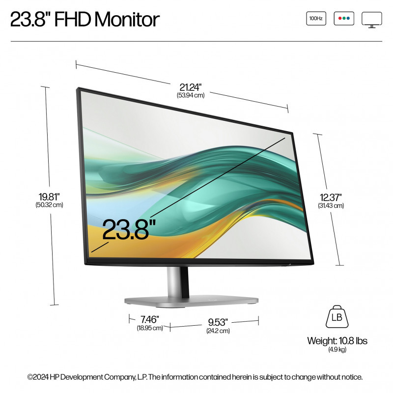 "HP Series 5 Pro 23.8 inch FHD Monitor - 524pf. Display diagonal: 60.5 cm (23.8""), Display resolution: 1920 x 1080 pixels, HD type: Full HD, Display technology: LCD, Display surface: Matt, Response time: 5 ms, Native aspect ratio: 16:9, Viewing angle, horizontal: 178°, Viewing angle, vertical: 178°. Built-in USB hub, USB hub version: 3.2 Gen 1 (3.1 Gen 1). VESA mounting, Height adjustment. Product colour: Black, Silver"\n"Reimagine what work looks like