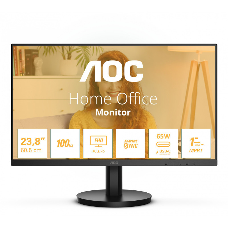"AOC 24B3CA2. Display diagonal: 60.5 cm (23.8""), Display resolution: 1920 x 1080 pixels, HD type: Full HD, Display technology: LED, Response time: 4 ms, Native aspect ratio: 16:9, Viewing angle, horizontal: 178°, Viewing angle, vertical: 178°. Built-in speaker(s). Built-in USB hub. VESA mounting. Product colour: Black"\n"High-performance clarity with 23.8"" FHD monitor featuring 100Hz refresh rate and HDMI