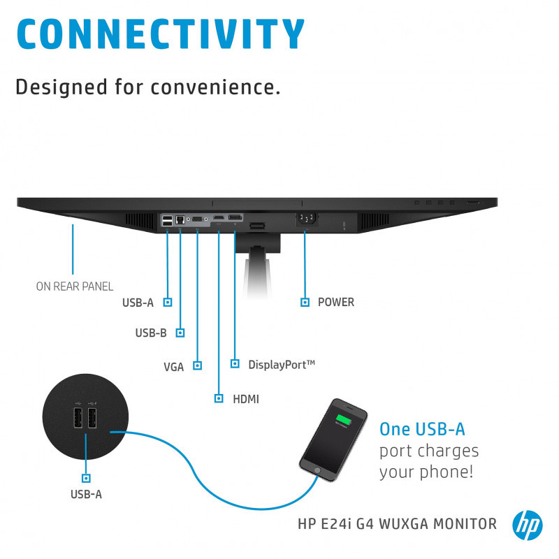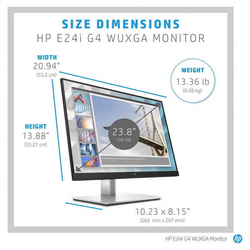 "HP E-Series E24i G4 WUXGA Monitor. Display diagonal: 61 cm (24""), Display resolution: 1920 x 1200 pixels, HD type: WUXGA, Display technology: LCD, Display surface: Matt, Response time: 5 ms, Native aspect ratio: 16:10, Viewing angle, horizontal: 178°, Viewing angle, vertical: 178°. Built-in USB hub, USB hub version: 3.2 Gen 1 (3.1 Gen 1). VESA mounting, Height adjustment. Product colour: Black"\n"Enhance your entire viewing experience