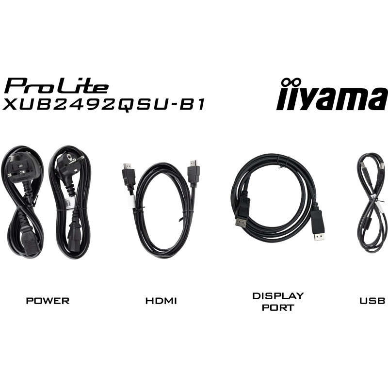 "iiyama ProLite 24” QHD IPS technology panel with USB hub, 100Hz refresh rate and height adjustable stand. Display diagonal: 60.5 cm (23.8""), Display resolution: 2560 x 1440 pixels, HD type: Wide Quad HD, Display technology: LED, Display surface: Matt, Response time: 1 ms, Native aspect ratio: 16:9, Viewing angle, horizontal: 178°, Viewing angle, vertical: 178°. Built-in speaker(s). Built-in USB hub, USB hub version: 3.2 Gen 1 (3.1 Gen 1). VESA mounting, Height adjustment. Product colour: Black"\n"Stylish edge-to-edge design makes the ProLite XUB2492QSU offering QHD (2560x1440) resolution is perfect for multi-monitor set-ups. The IPS panel technology offers accurate and consistent colour reproduction with wide viewing angles. The 100Hz refresh rate together with FreeSync function provides an instant, tangible improvement in image smoothness. High contrast and brightness values mean the monitor will provide excellent performance for photographic and web design. Equipped with speakers, USB 3.2 hub, headphone socket, HDMI and DisplayPort connections, a blue light reducer function to reduce eye fatigue and an ergonomic 150mm height adjustable stand for optimal user comfort, make this 24’’ monitor a great choice for both multi-monitor configuration and office applications."