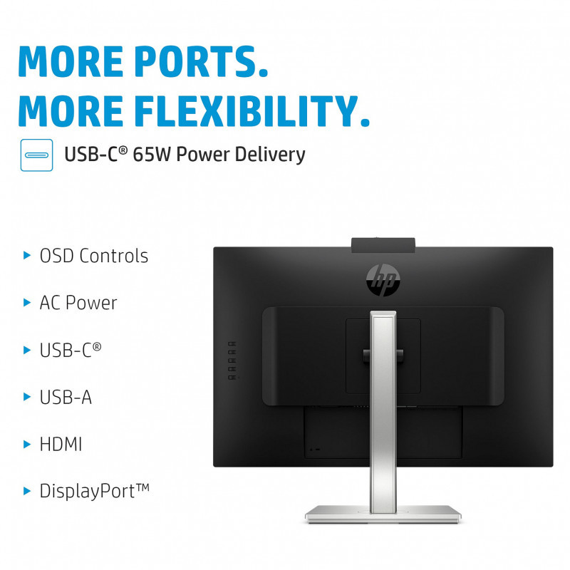 Conference and connect with ease with the Zoom Certified HP E27m G4 USB-C Conferencing Monitor that has an integrated 5MP, tilt-adjustable webcam, front-firing speakers, and dual mics. Work effortlessly and simplify your set up with one USB-C® cable[1] that delivers data, video, and up to 65W of laptop charging."